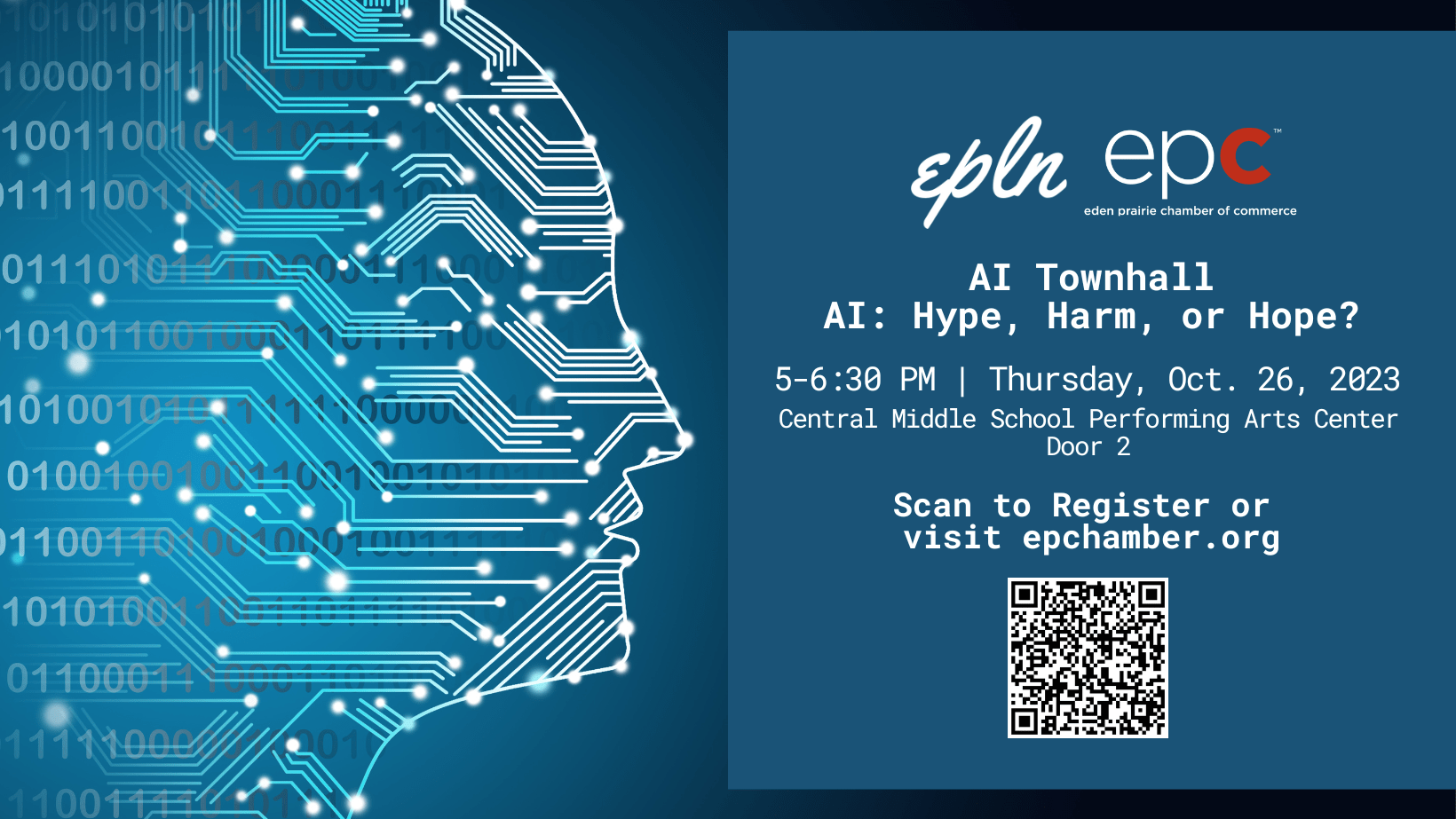 Join hosts, Eden Prairie Local News & the Eden Prairie Chamber of Commerce, for this Artificial Intelligence Town Hall from 5:00 - 6:30 p.m. The event is being held at the Performing Arts Center at Central Middle School located at 8025 School Road (Door 2).*By registering for this event, you agree to be added to communication from Eden Prairie Local News via email, where you have the choice to opt-out.